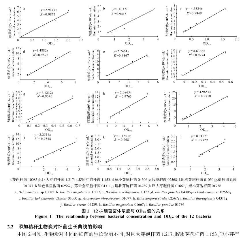 結果表明,秸稈生物炭對不同的細菌的生長影響不同,對于部分細菌存在明顯生長促進作用,其中對膠質芽孢桿菌1.217的促進作用最明顯,培養12h后其最大生長量可提高3.6倍;對于巨大芽孢桿菌1.217、短小芽孢桿菌04306以及褐球固氮菌01077,加入生物炭培養14~20h后最大生長量可提高1.5倍左右;巨大芽胞桿菌01667加入生物炭培養12h后,其最大生長量也可提高1.3倍;而對于另外一部分細菌,生物炭對其生長基本沒有影響或有較小的抑制作用。