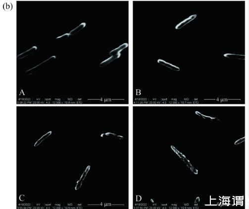 注:(a):不同濃度金銀花提取液對脂環酸芽孢桿菌細胞形態的影響;(b):不同濃度忍冬葉提取液對酸土脂環酸芽孢桿菌細胞形態的影響;A:Control,B:1 MIC,C:2 MIC,D:4 MIC。