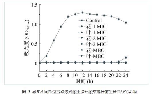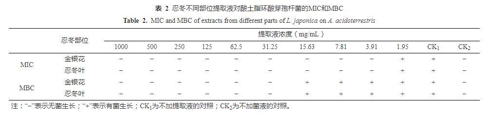 表2忍冬不同部位提取液對酸土脂環酸芽孢桿菌的MIC和MBC