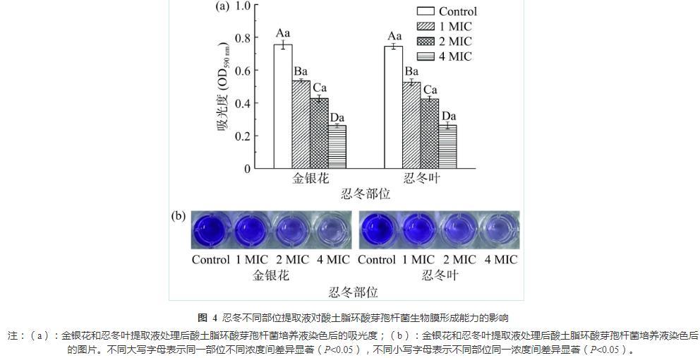 圖4忍冬不同部位提取液對酸土脂環酸芽孢桿菌生物膜形成能力的影響