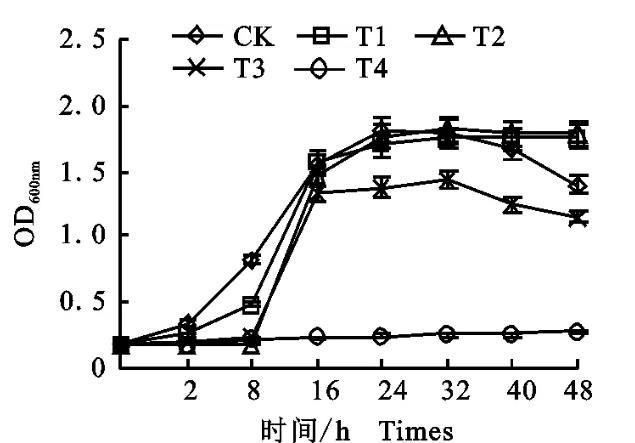 1.900,T3處理達到菌體最高生長量的時間提前至32 h(OD600nm=2.016)。磁化水對枯草桿菌活菌數影響的測定結果與菌液濃度變化相符合。由圖2可見,在磁化水培養基中,根瘤菌生長繁殖速度加快,0~48 h的培養周期中活菌數均高于普通水對照。培養48 h時,T1處理和普通水對照活菌數均達到最高值,T1較對照增加11.02%;T2、T3處理在40 h時活菌數達到最高值,較對照分別提高76.92%、72.47%。