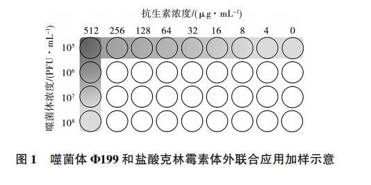 首先配制512μg/mL的抗生素稀釋液,在96孔板中每孔加入100μL MH培養液并通過倍比稀釋方法進行抗生素稀釋。大腸桿菌培養至對數期,用MH培養基稀釋至1×10^6 CFU/mL,每孔加入50μL菌液。準備效價為10^5~10^8 PFU/mL的噬菌體Φ199稀釋液,第1行到第4行加入50μL濃度分別為10^5、10^6、10^7和10^8 PFU/mL噬菌體,使每孔含200μL液體,具體加樣方式如圖1所示。