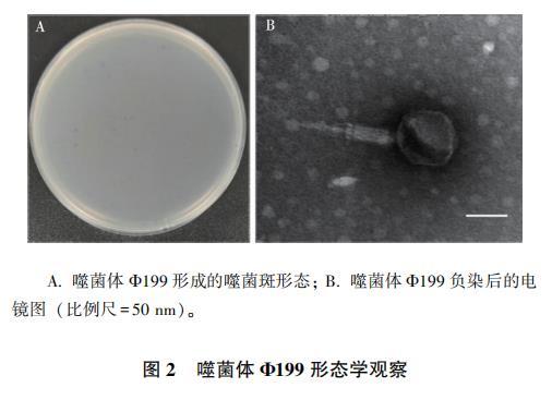 (圖2:A.噬菌體Φ199形成的噬菌斑形態;B.噬菌體Φ199負染后的電鏡圖(比例尺=50 nm))