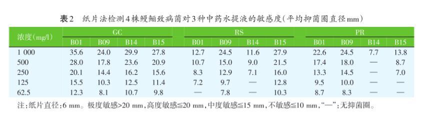 表2紙片法檢測4株鰻鱺致病菌對3種中藥水提液的敏感度(平均抑菌圈直徑mm)