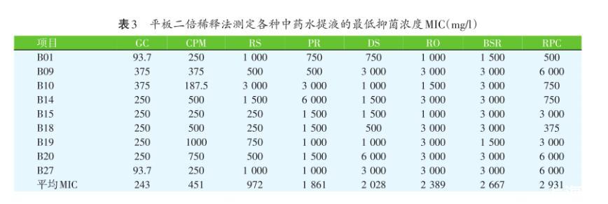 表3平板二倍稀釋法測定各種中藥水提液的最低抑菌濃度MIC(mg/l)