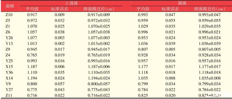通過用牛津杯法直接測量抑菌圈直徑大小,并經過計算機數據分析,計算均值及標準誤差如表1所示,可間接得出酶標法測得的16株試驗拮抗菌對指示菌哈維氏弧菌的拮抗效果,從而確定最佳目的拮抗菌為X14菌株和X15菌株。