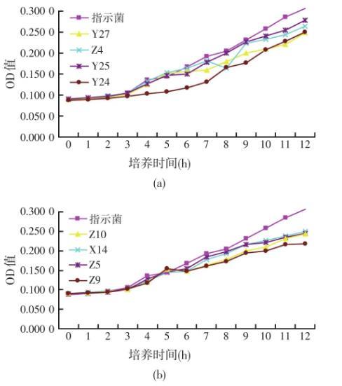 用點種法在實驗室保存的65株未知的海洋微生物菌株中,獲得18株出現抑菌圈的初篩拮抗菌。酶標法復篩,從生長曲線對比圖1(a,b,c,d)可看出各試驗菌的拮抗效果。在試驗菌發酵上清液拮抗下的指示菌生長曲線居于空白指示菌生長曲線之下的均可能存在拮抗效果。因此,初步確定X15、Y13、Y26、Y36、Z10、X14、Z5、Z9、Y9、Z11、Y27、Z4、Y25、Y24、Z6、Z1具有對指示菌哈維氏弧菌的拮抗作用。
