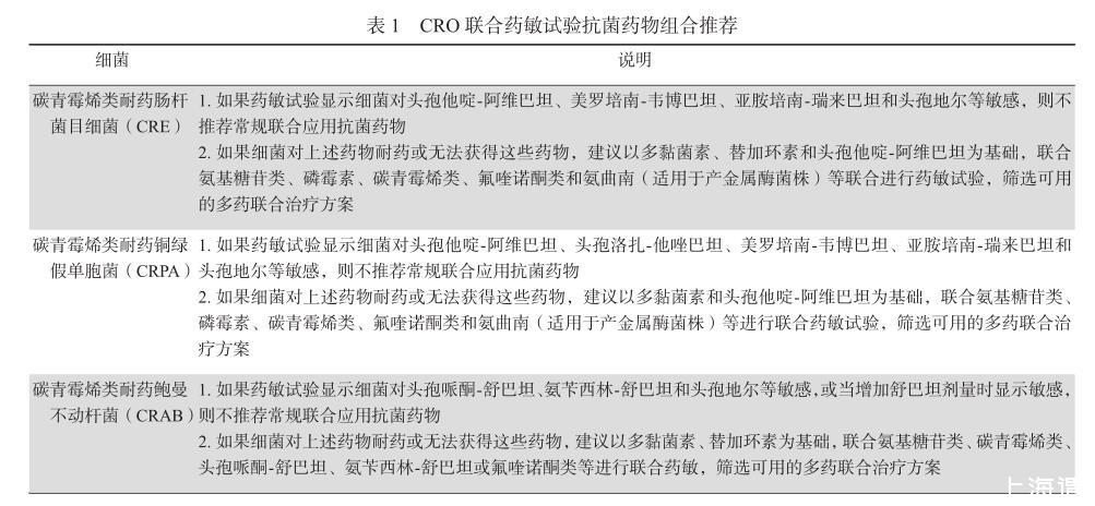 專家共識六:對于不同CRO菌株聯合藥敏試驗抗菌藥物的選擇,應參考臨床抗感染治療指南或專家共識確定,具體參考表1[22-30]。