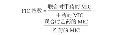 常用部分抑菌濃度指數(fractional inhibitory concentration index,FIC)為判斷依據[18-19],即①FIC≤0.5:協同作用,提示兩種藥物聯合后的抗菌活性顯著大于各單藥;②FIC>0.5~1:相加作用,提示兩種藥物聯合后的抗菌活性較各單藥稍有增加;③FIC>1~2:無關作用,提示兩種抗菌藥物的活性均不受另一種藥物的影響;④FIC>2:拮抗作用,提示一種抗菌藥物的活性被另一種抗菌藥物削弱。