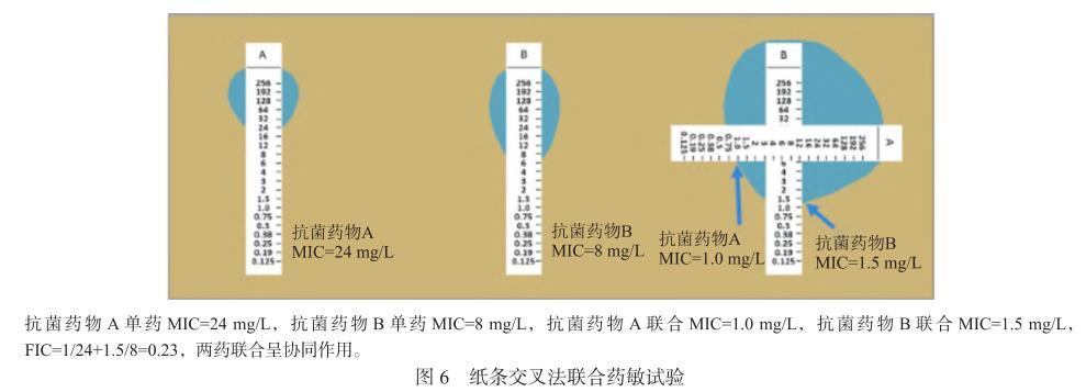 紙條法[17,21,32-34]亦稱梯度擴散法,所用材料名稱為E試驗條(Epsilometer,E-test)和MIC測試條(MIC test strip,MTS),是一種商品化的定量測定細菌對抗菌藥物敏感性的方法。它結合了稀釋法和擴散法的原理和特點,操作同紙片擴散法一樣簡便易行,結果又如同稀釋法一樣,可獲得定量的MIC值,結果準確,重復性好。紙條法包括兩種:①紙條優加法,操作時在一塊已涂布菌液的MHA平板上貼上含抗菌藥物A和抗菌藥物B的紙條;在另一塊已涂布菌液的MHA平板上先貼上含抗菌藥物A的紙條,30 min后,待抗菌藥物A完全滲透入瓊脂中后移去紙條,再在相同的位置覆蓋貼上抗菌藥物B。過夜孵育后閱讀抗菌藥物A單藥、抗菌藥物B單藥以及抗菌藥物A和抗菌藥物B堆疊后的MIC(圖5)。②紙條交叉法:抗菌藥物A和抗菌藥物B紙條垂直交叉放置(單藥MIC處交叉,因此需提前測定單藥MIC),孵育后閱讀聯合后抗菌藥物A和抗菌藥物B的MIC,計算FIC指數,判斷兩藥是否存在協同、相加、無關和拮抗作用(圖6)。紙條法具有操作簡單的特點,且結果容易閱讀。