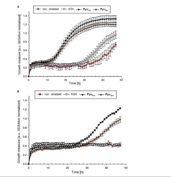 圖5、幽黑素對UV-C輻射的防護能力。應用ocelloScope展示了黑曲霉野生型(N402)和DHN-黑色素缺陷型(MA93.1)孢子在經過PyoFun和PyoSyn保護后,對UV-C輻射的耐受性的生長過程。結果顯示,PyoFun顯著提高了孢子的生存率,尤其是在DHN-黑色素缺陷型菌株中。