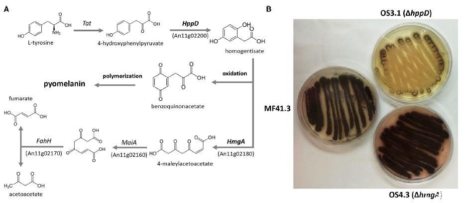 圖2、A)幽黑素生物合成途徑;(B)黑曲霉菌株的生長表型。圖(A)展示了黑曲霉中幽黑素形成的生物合成途徑,包括關鍵基因和代謝產物。圖(B)展示了在含有L-酪氨酸的培養基中培養時,野生型和基因敲除突變株(hppD和hmgA)的生長表型差異。