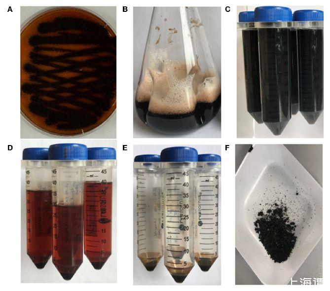 圖3、黑曲霉中幽黑素的生產和純化。展示了黑曲霉菌株OS4.3在含有L-酪氨酸的培養基中培養后,通過酸化和冷凍干燥步驟純化出的幽黑素(PyoFun)的過程。