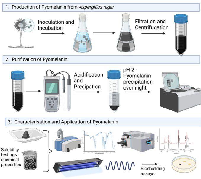 圖1、研究的實驗工作流程圖。展示了研究的整體流程,包括黑曲霉菌株的培養、幽黑素(PyoFun)的生產、純化、光譜分析、抗氧化測試以及輻射屏蔽測試等步驟。