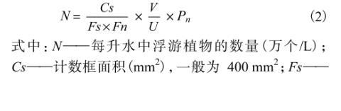 式中:N——每升水中浮游植物的數量(萬個/L);Cs——計數框面積(mm2),一般為400,mm2;Fs——每個視野的面積(mm2);Fn——每片計數過后視野數;Pn——每片通過計數實際數出的藻類個體數或細胞數;V——1,L水濃縮后的體積;U——計數框的體積,0.1,mL。
