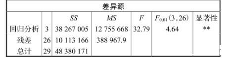 根據F檢驗的公式分別計算30組數據的各差異源的自由度、平方和以及均方,總結結果如表2所示。