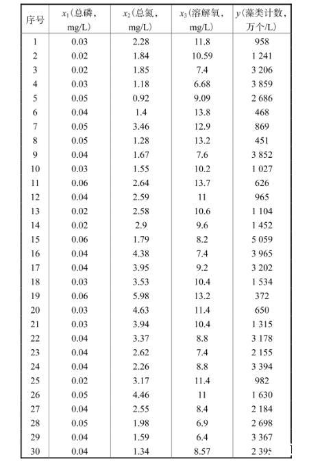 本文選取爾王莊水庫2013—2015年30組總磷、總氮、溶解氧和藻類計數的監測數據。這些數據基本反映了水體的水質情況,匯總結果如表1所示。假設4者之間存在線性關系且關系式為y=a+b1,x1+b2,x2+b3x3+b4x4,根據檢測結果匯總,通過多元線性回歸分析可得線性回歸方程: