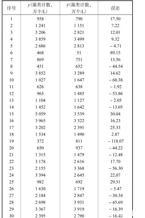 通過數據分析得出總磷、總氮、溶解氧與藻類計數之間存在極顯著線性相關性的結論,得到三元一次方程。根據方程計算出爾王莊水庫30,m的藻類計數結果與檢測所得藻類計數結果比較,計算相對誤差,誤差結果如表3所示。