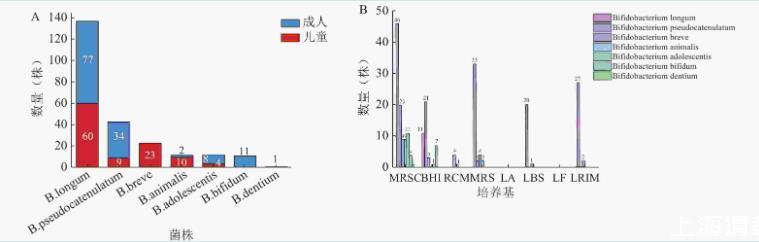 注:A為不同年齡段樣本雙歧桿菌分離鑒定結果;B為不同培養基雙歧桿菌分離情況。