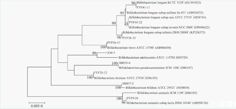 測序得到菌株序列,通過NCBI數據庫中已有數據對序列進行同源性比對,將同源性大于99%的菌株與同一種水平的模式株進行系統發育關系分析,部分菌株的系統發育結果如圖1所示,239株菌株均鑒定為雙歧桿菌。
