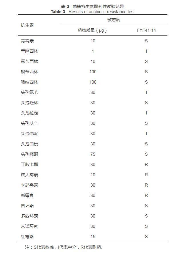 結果如表3所示。菌株FYF41-14對丁胺卡那、慶大霉素、卡那霉素及新霉素不敏感,對其余種類抗生素具有一定的敏感性,表明其具有一定的安全性。