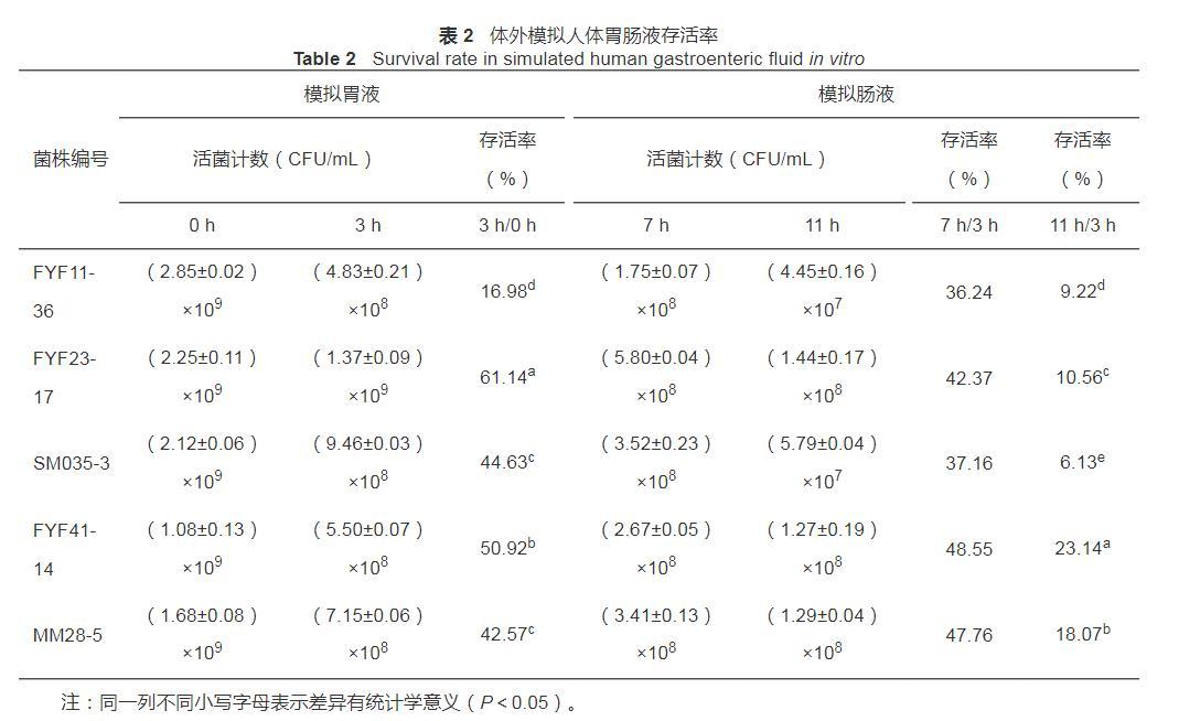 結果如表2所示,對上述5株雙歧桿菌進行模擬人工胃腸液試驗,結果表明,模擬胃液環境培養3 h后5株雙歧桿菌活菌數均呈現下降趨勢,其中菌株FYF23-17胃液3 h存活率最高,為61.14%,菌株FYF41-14次之,為50.92%,菌株FYF11-36最少,僅有16.98%。經模擬腸液環境培養8 h后,菌株FYF41-14腸液8 h存活率為23.14%,菌株MM28-5次之,為18.07%,菌株FYF11-36和SM035-3存活率未達到10.00%,因此選取存活率較高的菌株FYF23-17、FYF41-14、MM28-5進行益生特性的篩選。