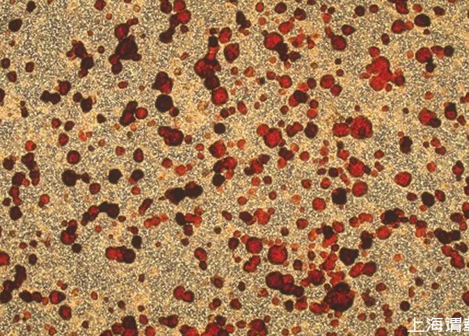 圖1染色固定干燥后的胃癌細胞(中性紅染色,×40)