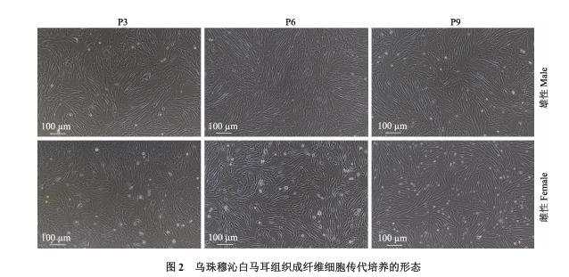 由于成纖維細胞與上皮細胞相比對酶消化液的敏感程度不同,用0.25%胰酶消化液處理,經傳代純化培養后,得到較純的成纖維細胞。雄性和雌性烏珠穆沁白馬耳組織成纖維細胞經過細胞傳代培養(圖2),均最多培養到80代(P80)。細胞呈現三角形,隨著細胞培養代次的增加,細胞生長匯合度達到80%以上需要的時間變長,且細胞形態由立體狀三角形形態逐漸變為扁平不規則多邊形形態。兩種耳組織成纖維細胞經傳代培養到后期,雄性耳組織成纖維細胞生長明顯優于雌性耳組織成纖維細胞,且雌性耳組織成纖維細胞的形態略微扁平,整體呈現長梭形。