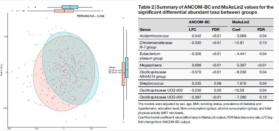 在方法上,研究采用橫斷面設計,將參與者根據抗抑郁藥使用情況及BDI-II評分劃分為抑郁組(DG)與對照組(RG),通過16S rRNA測序獲取腸道菌群數據,并使用液相色譜-串聯質譜(LC-MS/MS)技術分析糞便代謝物譜。微生物分析包括α多樣性、β多樣性、差異豐度分析(MaAsLin2和ANCOM-BC)與功能通路預測(基于PICRUSt2);代謝物分析則通過彈性網回歸(Elastic-net)與ANCOVA控制協變量進行篩選和驗證,并進一步計算微生物與代謝物之間的相關性。