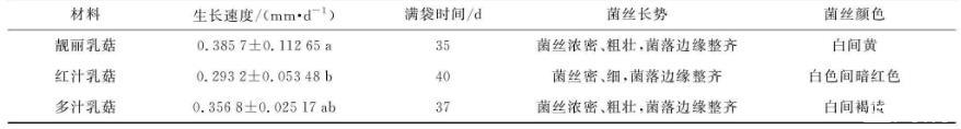 從表1可知,在相同母種培養基中,靚麗乳菇生長速度最快,日均生長量為1.13 mm,紅汁乳菇菌絲的生長速度相對較慢,靚麗乳菇與紅汁乳菇菌絲的生長速度達顯著差異;多汁乳菇菌絲的生長速度與靚麗乳菇和紅汁乳菇無顯著差異。