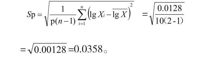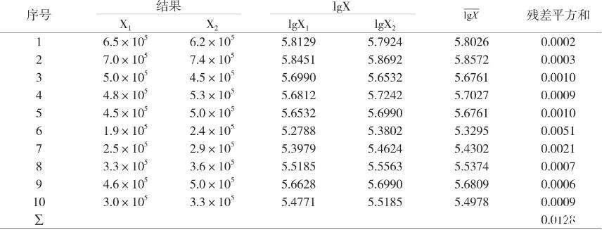從附表中的具體數據可以看出,該10份樣品中所測得菌落總數差異較大,因此,必須對檢測結果所得數值取對數后,再進行檢測結果對數值的標準偏差計算。按照統計學中A類評定,根據貝塞爾公式,計算最后結果: