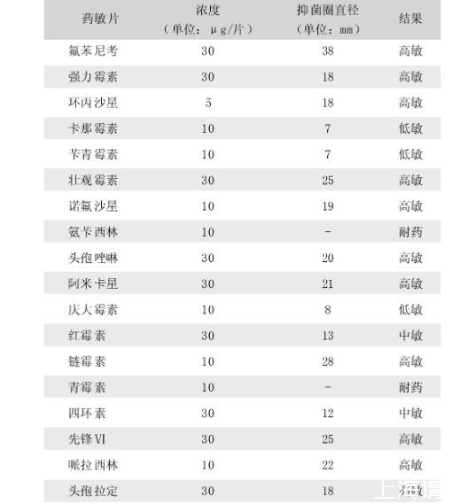 蘸取分離菌的肉湯培養物,接種于血瓊脂平板,將各種藥敏紙片分別平貼于培養基表面,37℃培養24h,測定抑菌環。