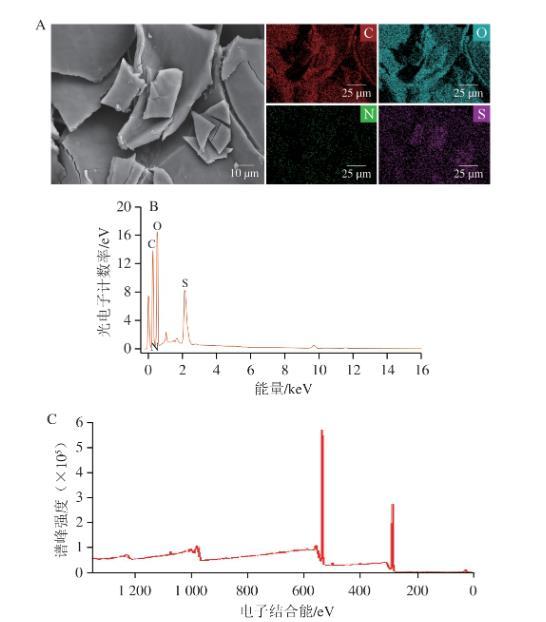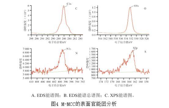 為了進一步了解M-MCC的元素分布情況,采用SEM-EDS和XPS分別對C、O、N、S進行元素分析。M-MCC中的元素分布情況如圖4A所示,包含C、O、N、S的EDS總譜圖如圖4B所示,可以看出,在M-MCC上可以檢測到N、S元素,而這兩種元素MCC本身不具備,由于L-Met接枝負載在MCC上而出現,這證明L-Met成功接枝到了MCC上。在能譜總譜圖中能夠觀察到N、S的特征峰,也證明了這一結論。