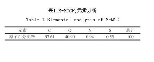 如圖4C所示,M-MCC由于分子中N、S元素含量較少,全譜分析中并未能直接看到N元素(N1s)和S元素(S2p)的結合峰。M-MCC的C1s結合能為286.11 eV,O1s結合能為532.5 eV。進一步對N1s和S2p的特征譜峰進行精細掃描分析,由峰形可以判斷出N、S元素的存在,但其較小的峰面積和峰強度也證實了N、S元素在M-MCC中含量較低。M-MCC的原子百分比如表1所示。由XPS所得到的N、S元素在M-MCC上的原子百分比僅為0.94%和0.55%,而C、O元素原子百分比則高達57.61%和40.91%。