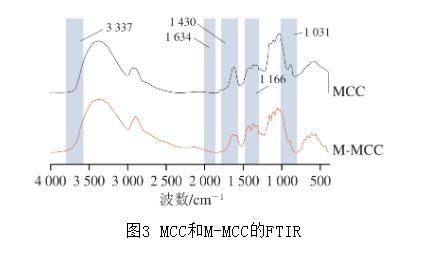 為了了解L-Met修飾對MCC形貌結構的影響,觀察MCC和M-MCC的微觀形貌和結構變化,采用SEM對MCC和M-MCC成像,結果如圖2所示。與具有多孔結構、呈現短棒狀的MCC相比,L-Met修飾的M-MCC表現出更粗糙的表面,呈片狀分布,且表面覆蓋有顆粒狀纖維。這種表面結構改變可能有助于增加M-MCC對細菌的接觸面積,進而提高抗菌活性,這有待進一步的確定。