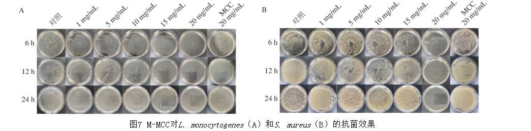 通過不同濃度的M-MCC抗菌實驗發現,M-MCC質量濃度在15 mg/mL時,培養液在培養24 h后仍然澄清,所測得的M-MCC的MIC和MBC分別為15 mg/mL和30 mg/mL。從12 h和24 h的平板菌落可以看出,15 mg/mL以上的M-MCC對L.monocytogenes和S.aureus都具有較好的抑制效果(圖7)。這可能是由于L.monocytogenes和S.aureus都是革蘭氏陽性菌,細胞壁與細胞膜結合不緊密,細胞壁結構較為簡單。