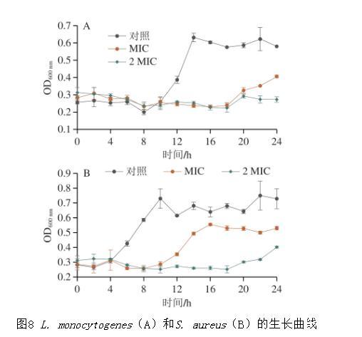 圖8 L.monocytogenes(A)和S.aureus(B)的生長曲線