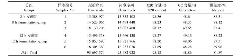 對8和12 h 2組不同發酵時間菌體細胞共6個樣本進行高通量測序,并對測序質量進行統計分析。結果(表4)顯示:原始測序序列(raw reads)去除帶接頭序列、空序列及低質量測序序列后分別得到15 352 102、14 498 440、18 087 468、15 466 120、15 821 766、16 257 026條純凈序列(clean reads),堿基GC含量平均為48.86%,低質量堿基測序序列(<Q20)占原始序列的比例很低,而高質量堿基序列(≥Q20)平均比例達到98.18%,說明測序數據的堿基組成情況和質量良好。將過濾后的測序序列比對到參考基因組上,發現測序序列均勻覆蓋在參考基因組上,能定位到基因組上測序序列的平均比例達87.89%。這些結果表明此次測序序列的整體質量良好,測序數據隨機性良好,可用于后續的分析。