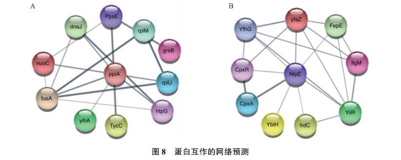 GO富集分析表明,ppia-l20基因變化與細胞膜的變化、轉移酶活性、代謝過程相關,KEGG通路分析預測,PPIA-L20蛋白位于陽離子抗菌肽抵抗通路,與雙組分調節系統、磷酸轉移酶系統活動相關; 與PPIA-L20蛋白位于共同通路(陽離子抗菌肽抵抗通路)的nlpE基因表達的外膜脂蛋白NlpE屬于DUF6轉錄因子家族,NlpE蛋白與雙組分調節系統中的cpxR基因、cpxA基因表達的蛋白具有互作關系。在腸桿菌科中,控制AMPs耐藥性的基因通常受雙組分信號通路以及磷酸轉移系統的控制,NlpE蛋白同時存在于PPIA-L20蛋白共同通路(陽離子抗菌肽抵抗通路)的上游,可能起到調控ppia-l20基因表達的作用,該蛋白相互作用網絡的構建為調控機制的推測提供線索。