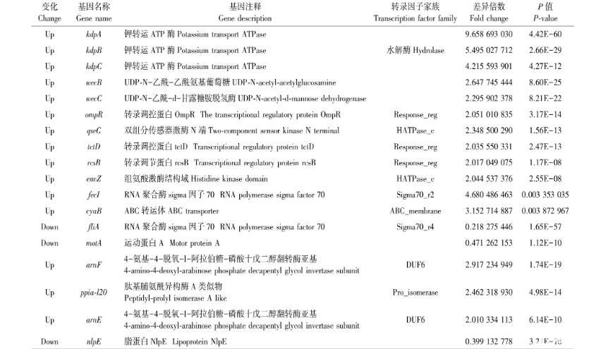 從表5可知,參與雙組分調節系統共有14個DEG,其中12個表達上調2個表達下調。ompR基因編碼的轉錄調控蛋白OmpR是雙組分調節系統的關鍵蛋白,qseC基因編碼雙組分傳感器激酶N端結構。目的基因ppia-l20位于陽離子抗菌肽抵制通路中,位于同一條通路上的3個基因中,arnF和eamA編碼的蛋白屬于DUF6轉錄因子家族,其表達上調,另一個基因nlpE負責編碼外膜脂蛋白,參與銅離子的攝取和黏附功能,其表達下調。