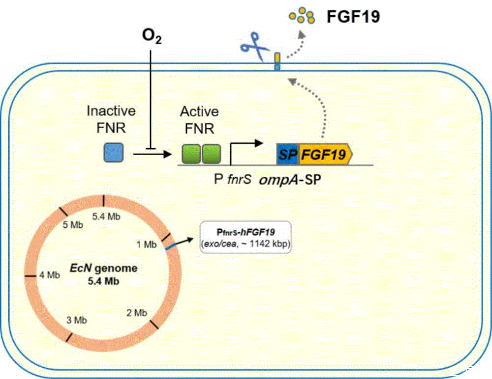 細菌內源性FnrS的啟動子(PfnrS)在氧氣存在下是無活性的,但在厭氧或微氧條件下與FNR結合被激活;基于此,采用了PfnrS啟動子驅動FGF19的表達,從而使工程菌被口服灌胃后在腸道深處無氧/微氧情況下得以啟動目標基因的表達。人源FGF19基因的CDS序列經密碼子優化(E.coli Codon Usage Analyzer 2.1)后連接細菌內源ompA的信號肽序列,然后與rrnB T1終止子序列一起組成PfnrS+ompA信號肽+FGF19 CDS+rrnB T1終止子的表達框,表達框全長1020 bp核苷酸。該設計將促使工程菌在腸道內低氧環境下能夠高效表達FGF19,同時分泌至細胞外面,有效接觸作用腸道黏膜,工程菌工作模式見圖1。