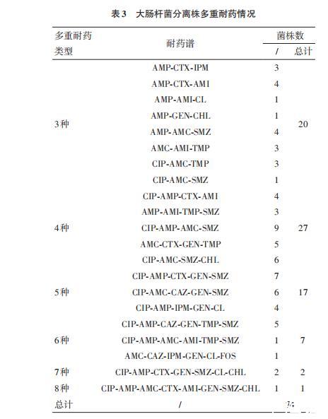 通過對大腸桿菌分離株的多重耐藥情況分析發現,共有74株(占分離株61.67%)對3種及以上抗菌藥物耐藥,最多可以對8種抗菌藥物耐藥,其中對4種抗菌藥物耐藥的菌株數量最多,有27株(占分離株22.50%)。多重耐藥結果基于表3內容總結如下: