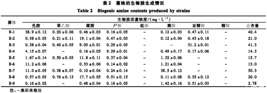 為進一步確認這9株菌的產胺能力,將9株菌株分別接種到TSB培養基中,30℃培養3 d,分析培養液中生物胺產生質量濃度,結果如表2所示。由表2可知,9株菌均可產生色胺、腐胺和尸胺,菌株B-9生物胺生成能力較其他菌株最弱,總質量濃度為2.78 mg/L。B-1、B-3和B-7的產胺能力較強,總生物胺質量濃度分別為40.4、41.3和50.3 mg/L。其中B-1的色胺產生質量濃度最高,為38.9 mg/L;B-3亞精胺產生質量濃度最高,為31.2 mg/L;B-7酪胺產生質量濃度最高,為38.5 mg/L。