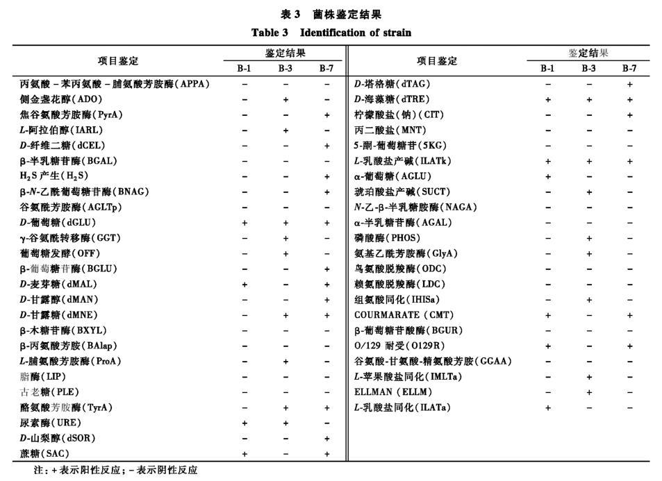 VITEK 2鑒菌儀是通過將檢測菌株的各項生理生化實驗反應結果與已知的菌株數據庫作比較,從而推測菌株的可能性概率,可信概率范圍為85.0%~99.0%。經鑒定,3株菌株的生理生化實驗結果如表3所示。鑒定B-1菌株為巨型球菌(Macrococcuscaseolyticus),可信概率為99.0%;B-3菌株為產堿普羅威登斯菌(Providenciaalcalifaciens),可信概率為97.0%;B-7菌株為糞腸球菌(Enterococcusfaecalis),可信概率為99.0%。