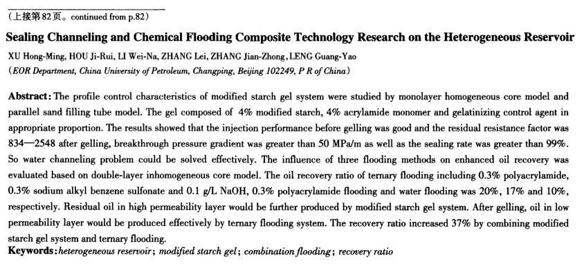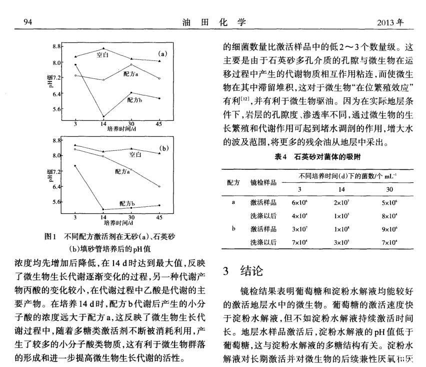 【摘要】:微生物驅油過程中不同的地層條件對微生物的生長會產生明顯的影響。本實驗模擬勝利油田孤島中一區Ng3區塊地質條件,考察了地層水、地層多孔介質(石英砂)及含油多孔介質對微生物生長的影響。使用了兩種不同配方的激活劑,配方a:1 g/L葡萄糖、0.15 g/L蛋白胨、0.05 g/L酵母粉、0.1 g/L硝酸銨、0.05 g/L磷酸氫二銨;配方b:5 g/L淀粉水解液、0.1 g/L硝酸銨、0.1 g/L磷酸氫二銨、1 g/L尿素。結果表明,地層條件下多孔介質對微生物的生長影響較大,與單純地層水培養相比,多孔介質條件下的微生物鏡檢菌數較低,這與多孔介質對菌體的吸附性有關。在不同的激活劑作用下,淀粉水解液的效果優于葡萄糖,淀粉水解液激活后溶液的pH值由8降至5,并產生較多小分子酸,這有利于微生物采油效果的持續性。鏡檢表明,多孔介質可吸附的菌數大于10~4個/mL,這對于微生物在多孔介質內生長繁殖有較好的促進作用。