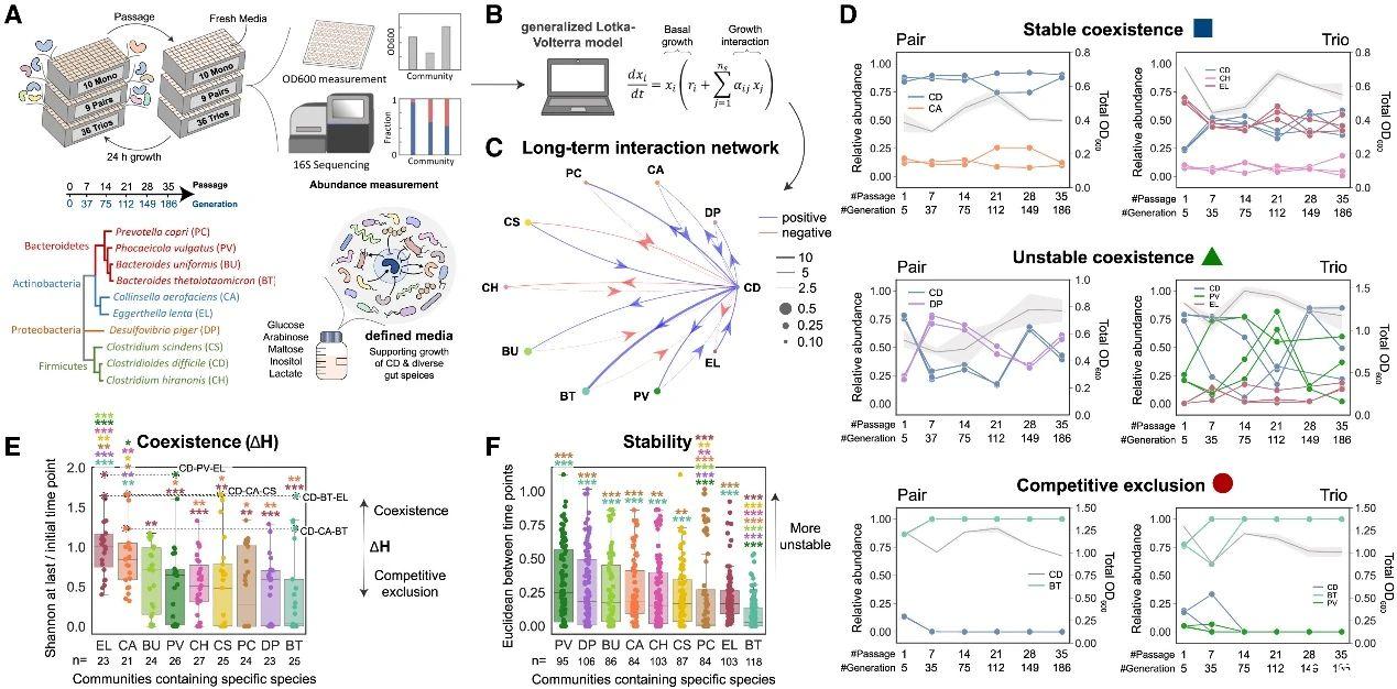 (D)艱難梭菌與腸道細(xì)菌在成對(左)和三成員(右)群落中的代表性群落動態(tài)。由彩色線條連接的數(shù)據(jù)點(diǎn)表示每個物種的相對豐度(左y軸),而帶有95%置信區(qū)間陰影的灰色線條表示群落OD600(右y軸)。完整的群落動態(tài)見圖S1C(成對)和圖S2A(三成員)。穩(wěn)定共存、不穩(wěn)定共存和競爭排斥的分類依據(jù)圖S2B。(E)使用最后一個時間點(diǎn)相對于初始時間點(diǎn)的香農(nóng)多樣性來測量所有包含x軸所示特定物種的成對和三成員群落中共存程度(ΔH)。