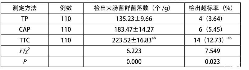 3種不同檢測(cè)方法的檢出大腸菌群菌落數(shù)和檢出超比率相比較,差異均具有統(tǒng)計(jì)學(xué)意義(P<0.05);其中TCC法在兩項(xiàng)指標(biāo)中均最高,差異也具有統(tǒng)計(jì)學(xué)意義(P<0.05)。見(jiàn)表2。