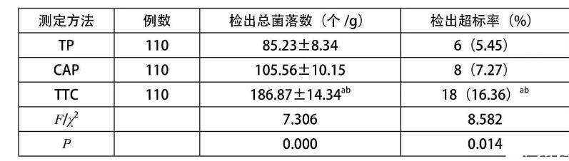 3組不同檢測(cè)方法檢出總菌落數(shù)相比較,差異具有統(tǒng)計(jì)學(xué)意義(P<0.05)。其中,TCC法檢出總菌落數(shù)顯著高于TP法和CAP法,差異也具有統(tǒng)計(jì)學(xué)意義(P<0.05)。3種不同檢測(cè)方法的檢出超標(biāo)率相比較,差異具有統(tǒng)計(jì)學(xué)意義(P<0.05)。其中,TCC法的檢出超標(biāo)率顯著高于TP法和CAP法,差異也具有統(tǒng)計(jì)學(xué)意義(P<0.05)。見(jiàn)表1。