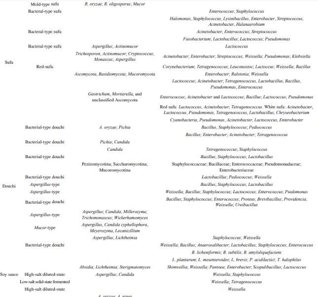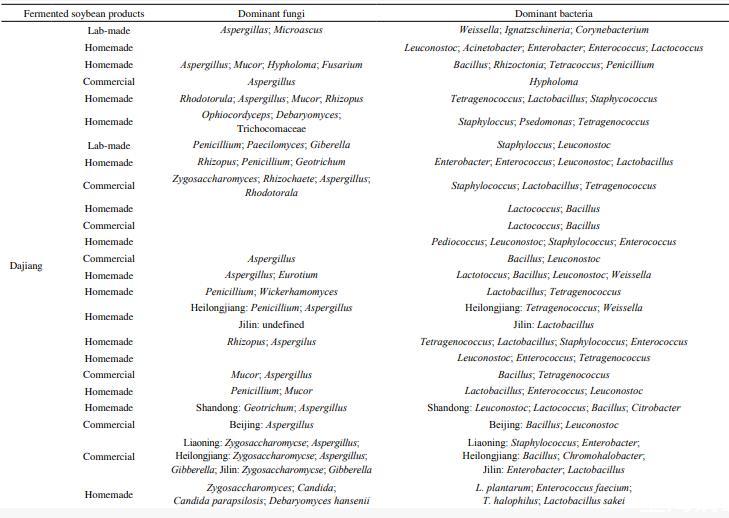 大醬、腐乳、豆豉和醬油的制作加工流程如圖1所示,在發(fā)酵過程中,不同地區(qū)的使用原料、工序和習慣不同,導致微生物的菌群結構產(chǎn)生差異,大醬、腐乳、豆豉和醬油中的優(yōu)勢菌屬總結見表1。