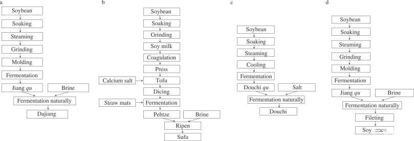 圖1傳統(tǒng)發(fā)酵豆制品(包括大醬、腐乳、豆豉和醬油)的發(fā)酵工藝流程圖
